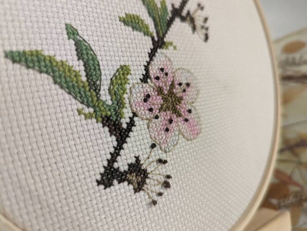 Ajoutez une touche de fraîcheur et de douceur à votre décoration avec cette broderie au point de croix de branche de pêcher en fleur, réalisée à la main. Chaque point, minutieusement posé avec fils de laine DMC, capture la beauté délicate de cette fleur printanière, créant une œuvre d'art raffinée et unique, parfaite pour sublimer n'importe quelle pièce.