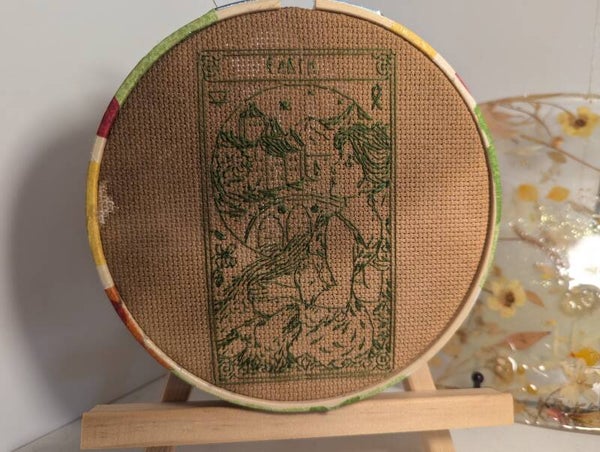 Ajoutez une touche d'élévation et de sérénité à votre décoration avec cette carte de Tarot des éléments "Terre", réalisée à la main. Chaque point de broderie, soigneusement exécuté avec du fil de laine DMC sur une toile en lin, incarne la puissance et l'ancrage de l'élément Terre, apportant stabilité et harmonie à votre espace.