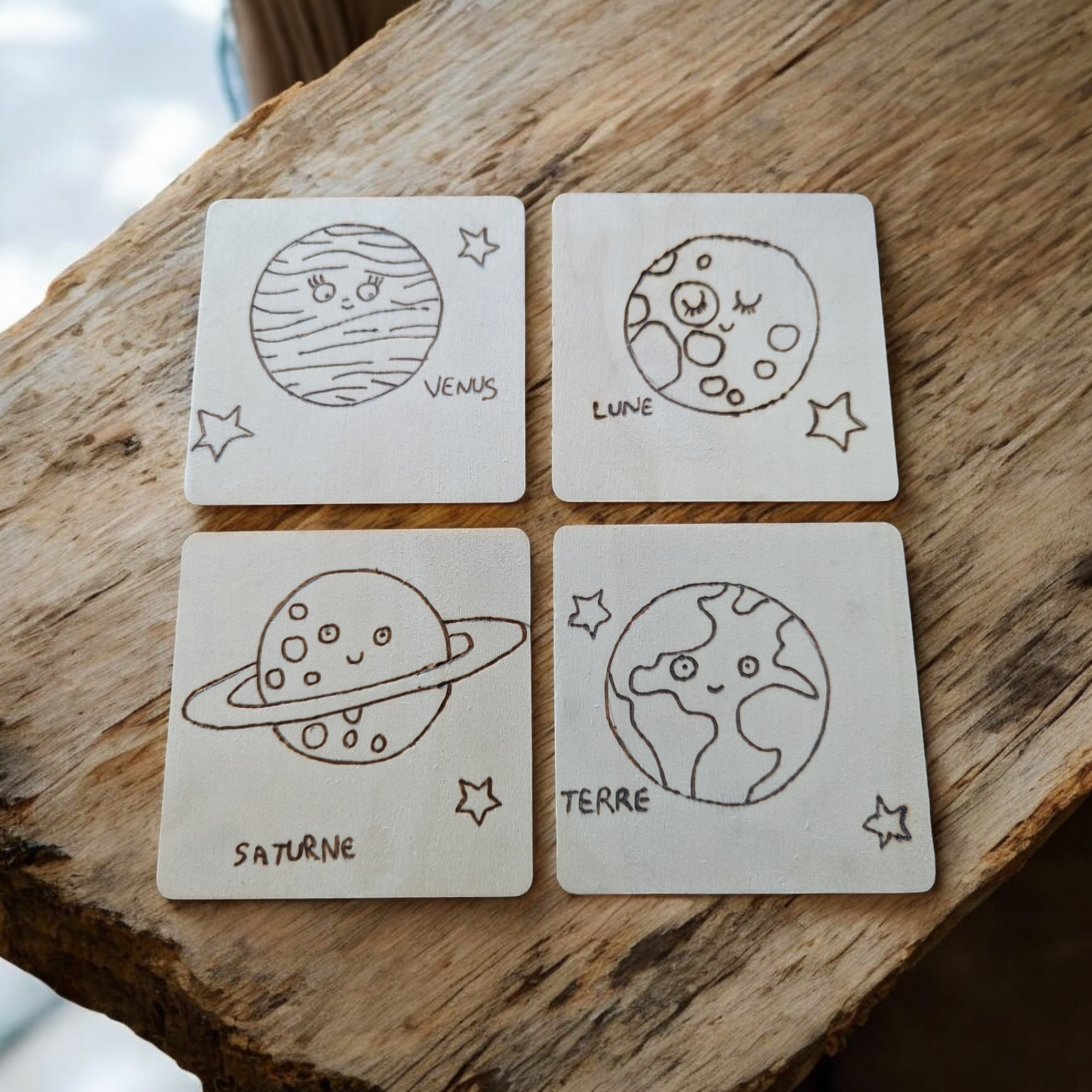 Apportez une touche d'originalité et de magie cosmique à votre table avec ces dessous de verre pyrogravés Planètes mignonnes et laissez leur charme interstellaire illuminer votre décor. 🌌🌙