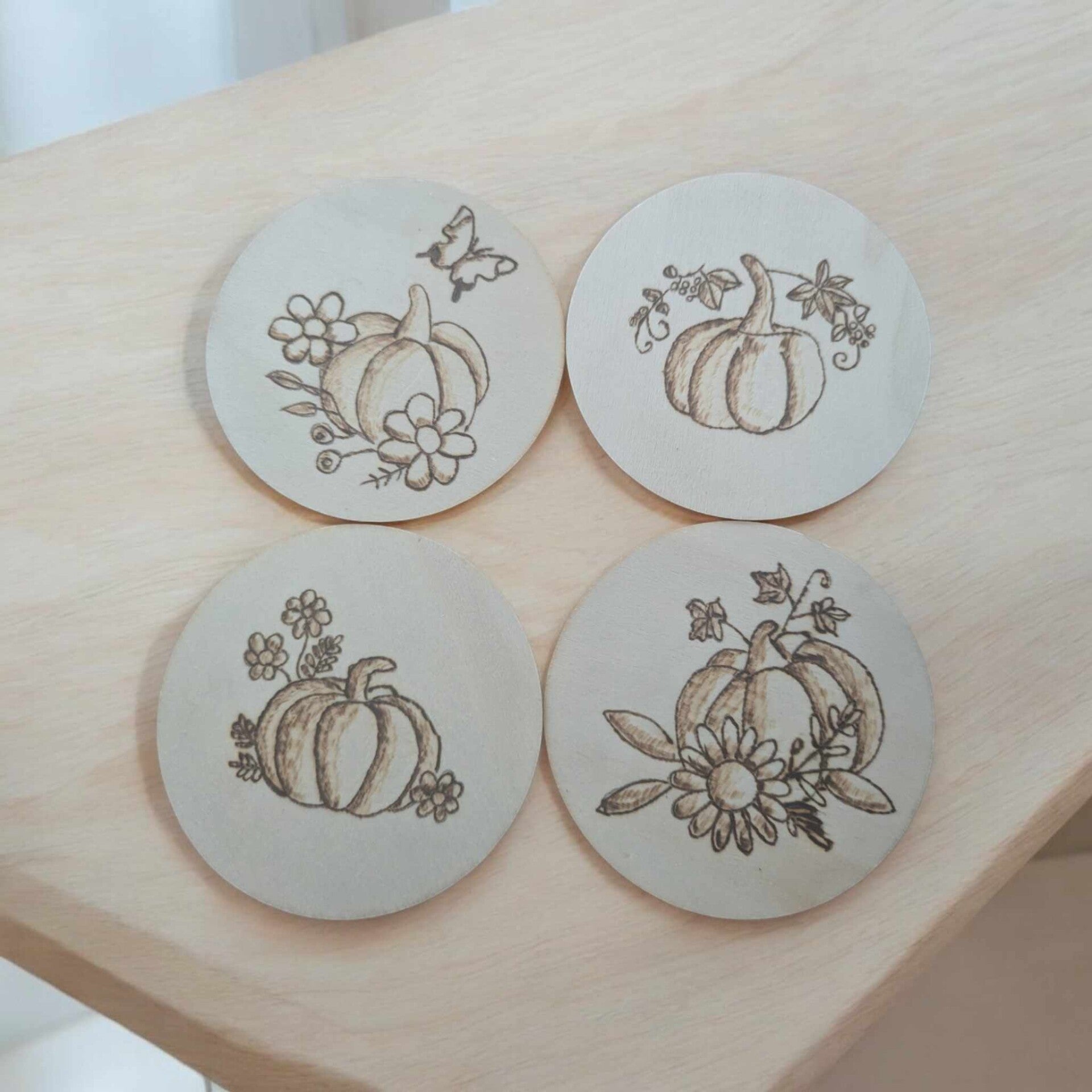 Apportez une ambiance chaleureuse et pleine de charme à vos repas et vos moments conviviaux avec ces dessous de verre pyrogravés "Citrouilles". 🎃🍂