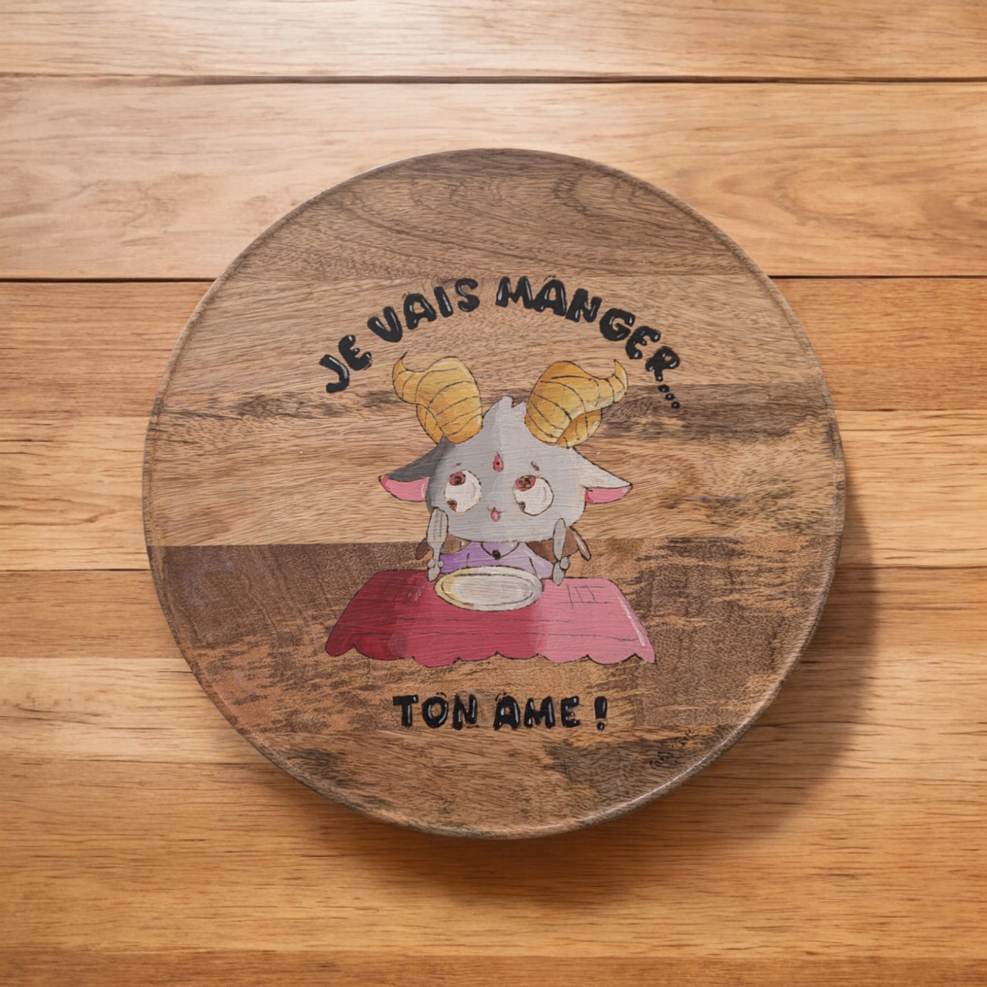 Apportez une touche mystique et originale à votre intérieur avec ce plateau en manguier de 30 cm de diamètre, pyrogravé et peint à la main. Le design Baphomet est finement gravé pour capturer toute la puissance et la symbolique de cette figure mystique, tandis que les touches de peinture ajoutent une dimension supplémentaire à cette pièce unique. Le plateau en manguier est robuste et élégant, parfait pour servir ou simplement décorer votre espace avec style. Étant une pièce unique, chaque plateau peut présenter de légères variations, garantissant une œuvre vraiment originale.