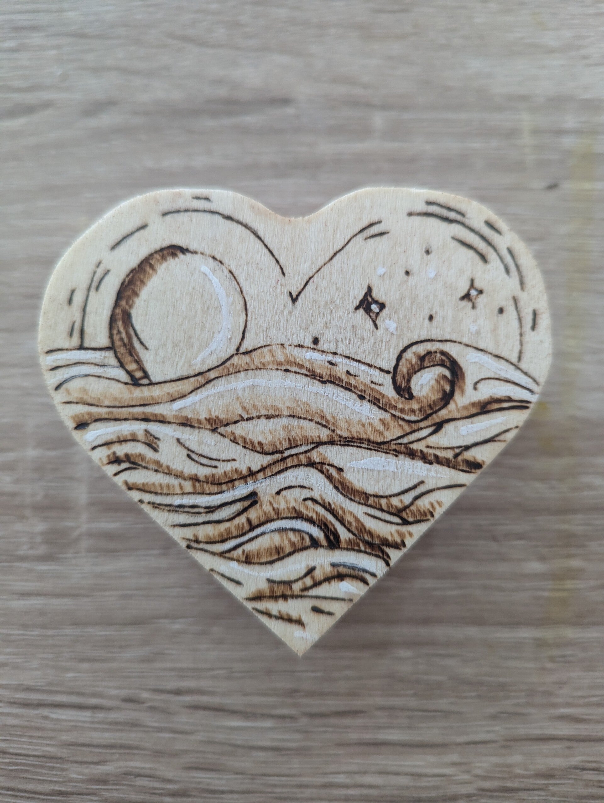 Emportez un peu de la beauté apaisante de l’océan avec cette boîte en forme de cœur, finement pyrogravée à la main. Mesurant 10x4 cm, elle capture l’essence même de la mer, avec des vagues délicatement sculptées et un paysage marin qui évoque la sérénité des rivages. Chaque détail, des vagues douces aux cimes des vagues qui se brisent sur le sable, est minutieusement travaillé pour recréer l’atmosphère calme et rafraîchissante de l'océan.