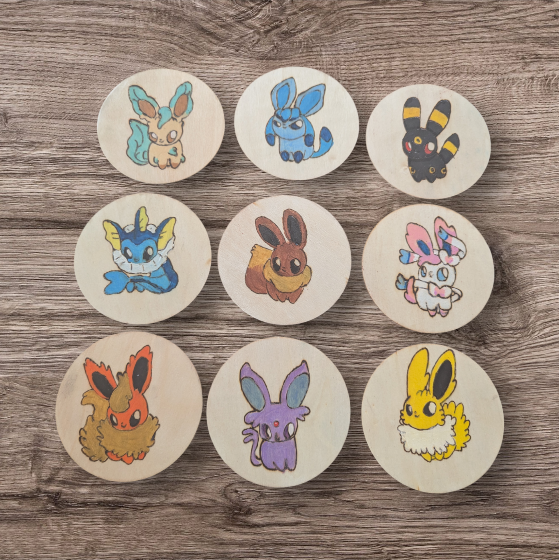 Dessous de verre pyrogravés : Evoli et ses évolutions peintes