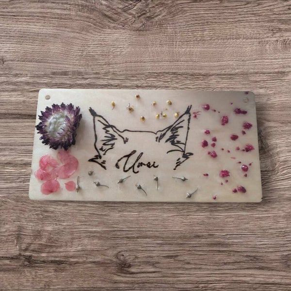 Ajoutez une touche unique et chaleureuse à votre intérieur avec cette plaque pyrogravée et résinée de chat 100% personnalisable. Chaque détail, soigneusement gravé et fini avec une résine brillante, met en valeur l'image de votre compagnon félin dans un style délicat et moderne. Parfaite pour personnaliser votre décoration, elle incarne à la fois la beauté de l'artisanat et l'amour inconditionnel pour votre chat.