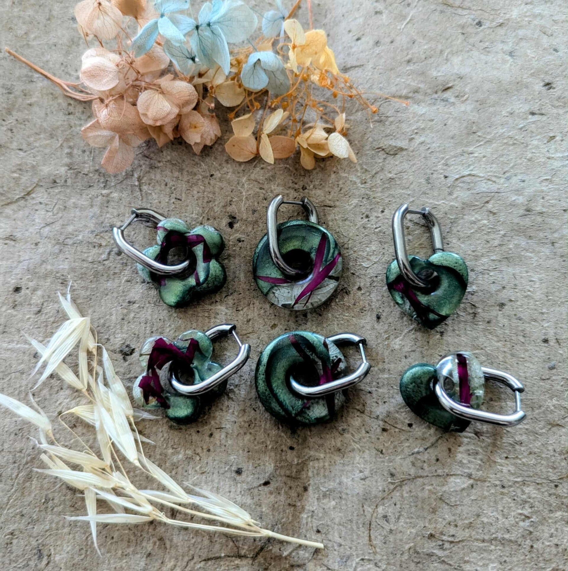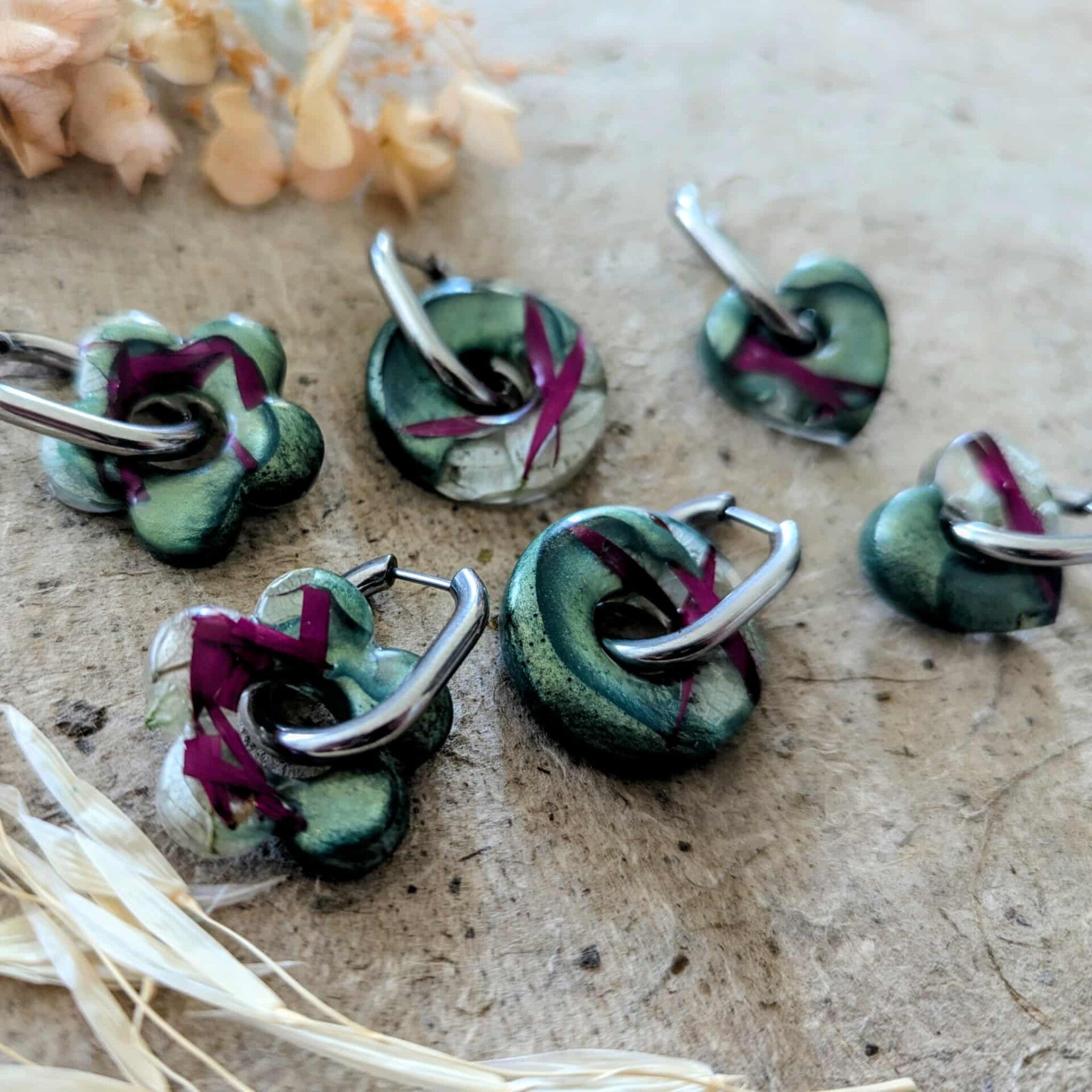 Réalisées en résines, ces suspensions sont agrémentées colorant vert, petites feuilles sur tige rouge séchées, et beaucoup d'amour!