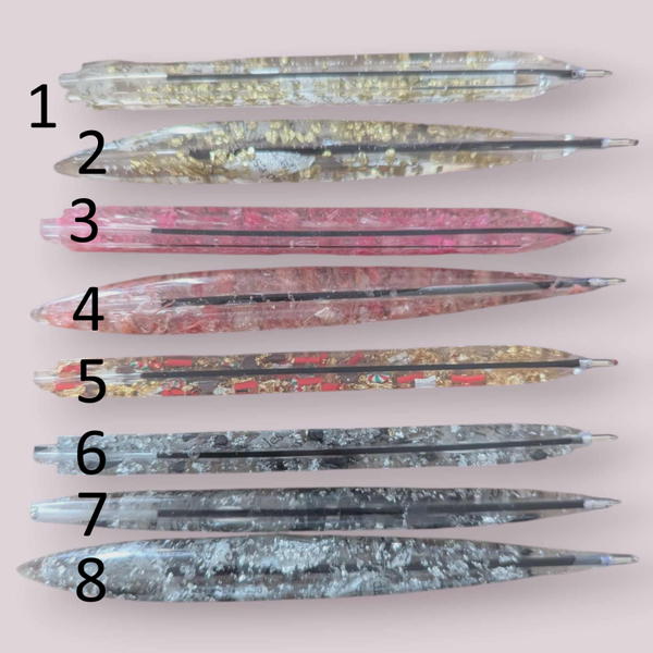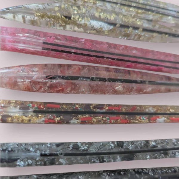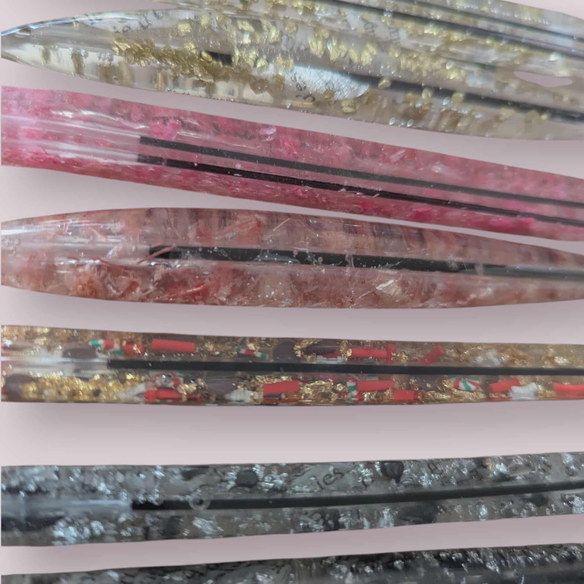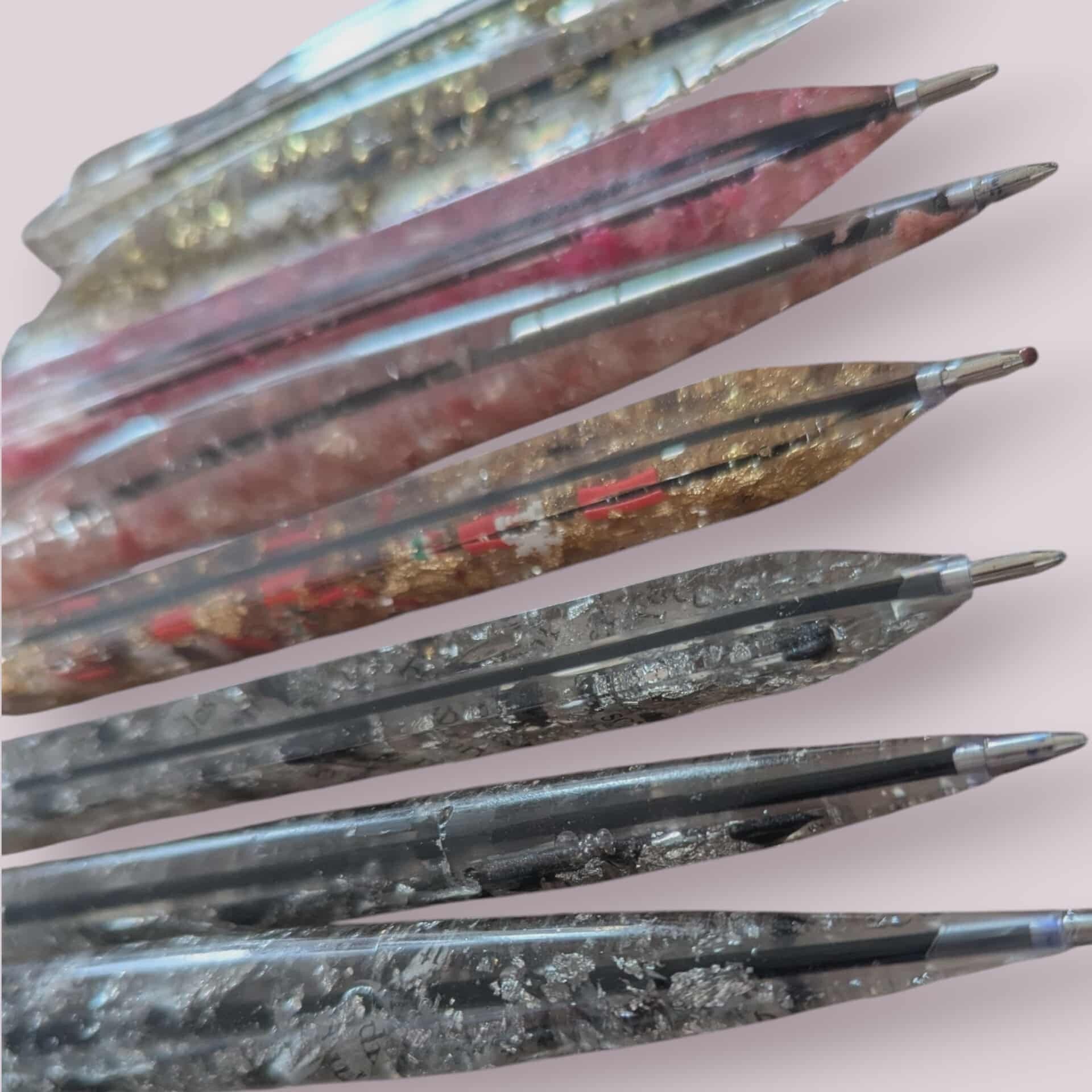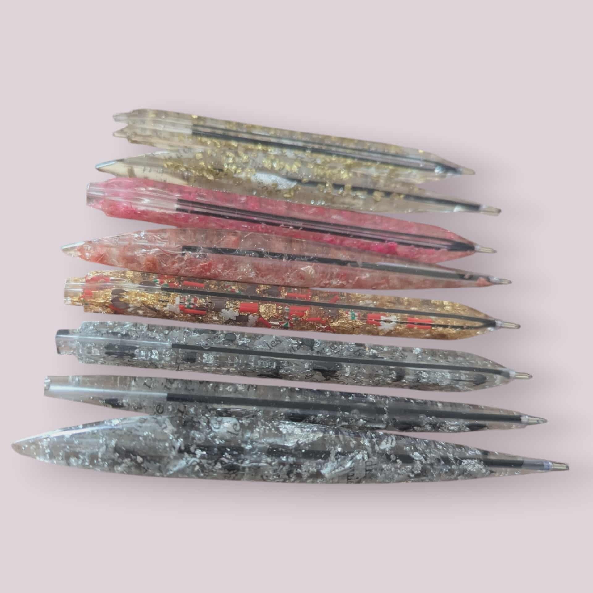 Chaque corps de stylo est décoré avec soin : j’y ai intégré fleurs séchées, colorants, feuilles dorées ou argentées, pages de livres déchirées et bien plus encore, créant des effets de profondeur uniques et des jeux de transparence propres à la résine.