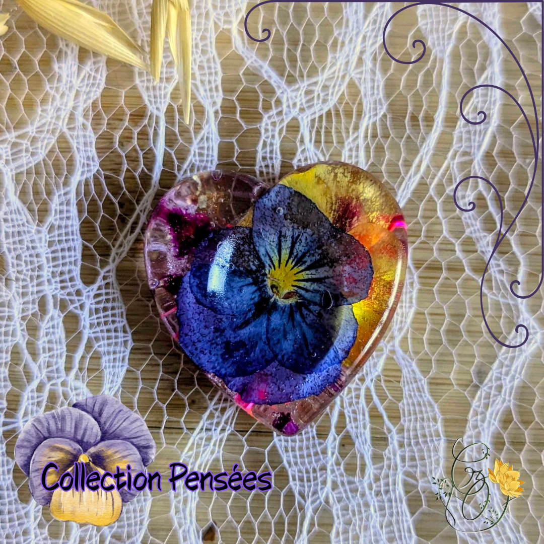 Chaque pièce contient une véritable fleur de pensée séchée à la presse, intégrée dans de la résine transparente. Des éclats de nacre colorée et de petits éléments décoratifs viennent compléter la composition, créant un objet à la fois esthétique et sensoriel.