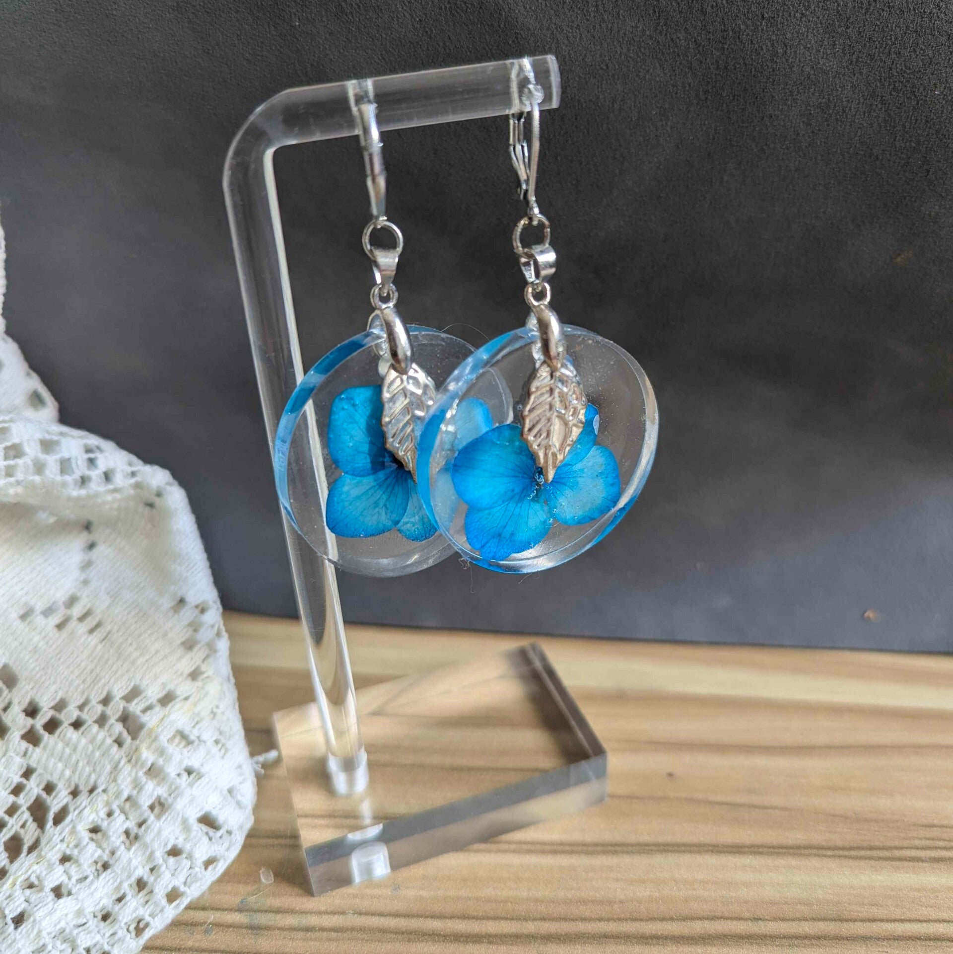 Ces boucles d’oreilles sont réalisées à la main avec de la résine transparente, dans laquelle sont intégrées de vraies fleurs séchées.